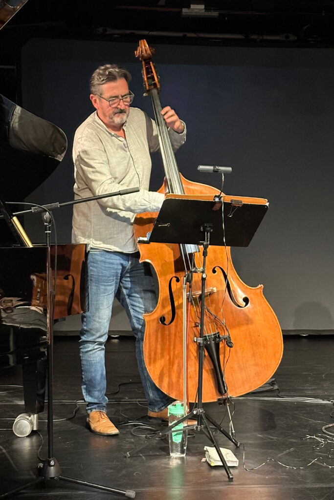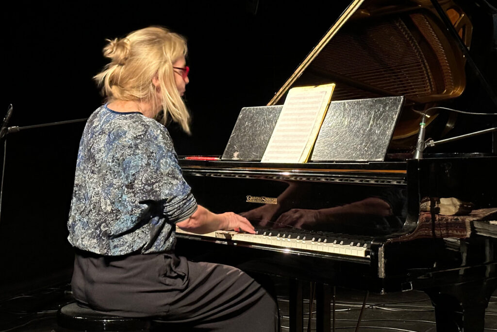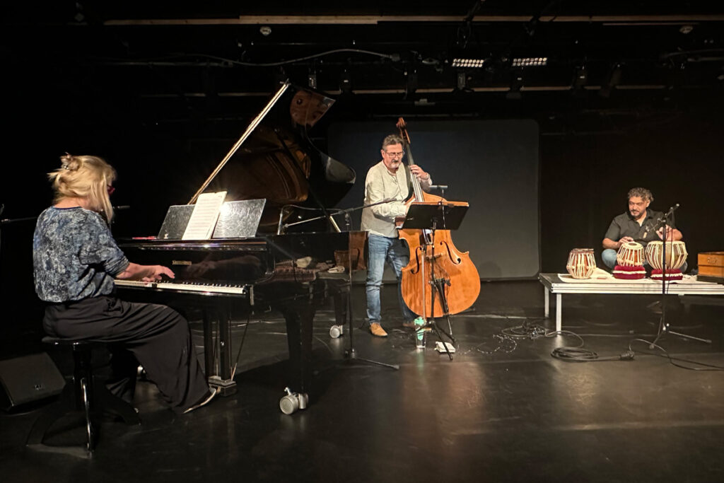 Am Freitag fand im Dock 4 ein intensiver Konzertabend in zwei Teilen statt. Zunächst schlugen die Künstler mit „Jazz Meets Tabla“ eine Brücke zwischen den Kulturen. Vor über 40 Gästen sorgten Ursel Schlicht, der Kontrabassist Rolf Denecke (Kassel) und der Tablaspieler Shams Hashemi Mahmoud (Frankfurt) für einen kraftvollen Flow. Sie verbanden modalen Jazz mit den rhythmischen Strukturen afghanischer Musik. Da gab es treibende Ostinati, durchsetzt mit spannungsgeladenen Klavierakkorden. Das subtile, sich immer wieder virtuos steigernde Spiel auf den Kesseltrommeln durchpulste das Ganze.