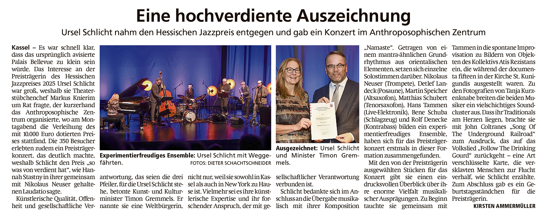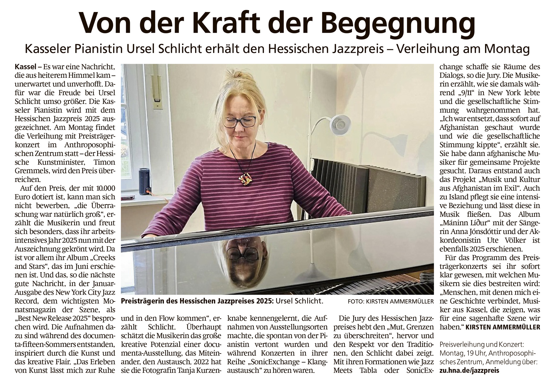 Im Anschluss an die Preisverleihung am 15.12.2025 im Anthroposophischen Zentrum wird ein Konzert drei Aspekte der musikalischen Tätigkeit von Ursel Schlicht aus Jazz, Improvisation und Interdisziplinarität präsentieren.