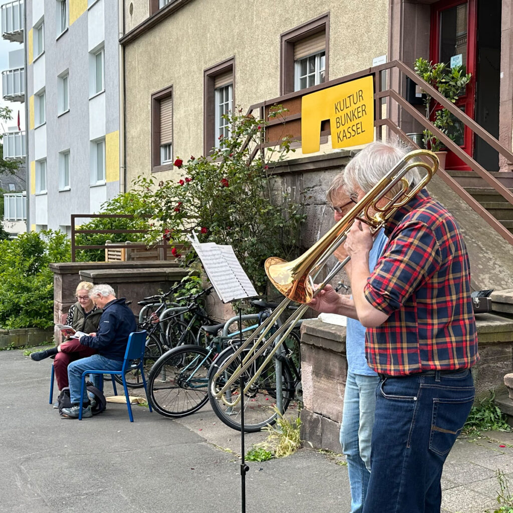 Akteur*innen des Kulturbunkers werden diese Aktion musikalisch begleiten. Das ist eine Besonderheit beim Kulturbunker, wo viele Musiker*innen ein und aus gehen.
